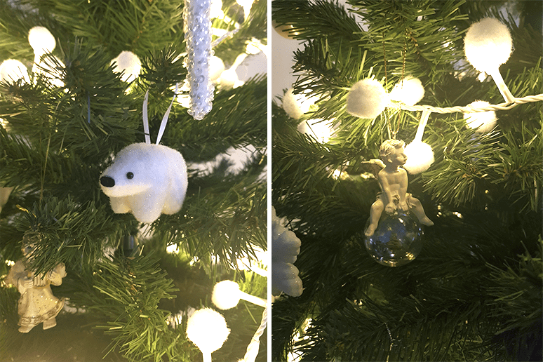 Eerst vier ik altijd Sinterklaas waarna het moment is om de boom naar binnen te brengen. De kerstboom gaat dus vrij laat naar binnen voor een kerstliefhebber als dat ik ben, maar dat heeft ook als voordeel dat hij pas eind januari weer naar buiten gaat. Voor de decoratie?! Dit jaar gaan we voor wit met zachte lampjes. Witte rozen, schaapjes, sterren, zelfs ijsberen ontbreken niet, ballen en die combineert ze met champagne parelmoer ballen. Het enige wat ontbreekt, is de piek; twee lampjes zitten op de top. Cadeaupapier pas ik altijd aan op de kleur van de kerstballen.
